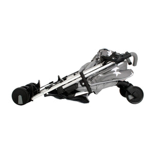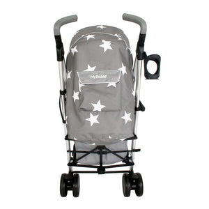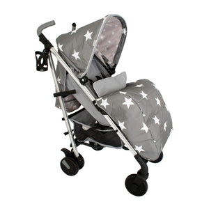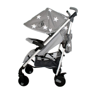 This stylish grey star stroller from Billie Faiers forms part of her Signature Range My Babiie and combines the style and function you expect from a super talented mum. Tough enough to take everywhere with you and use every day, the lightweight aluminum umbrella fold stroller is packed with features to make using it as comfortable for you and your little one as possible. Suitable from birth, the seat reclines right back and has adjustable leg support so your little can sit, or lay back in total comfort, and shade from the sun and elements by an extendable 3 position UPF canopy. Suspension all round and single front wheels means the ride is super smooth, and adjustable handles mean you can push in comfort too. The basket is large and there is a handy pocket at the back of the hood for your phone (or snacks!), and a viewing window so you can maintain a visual of your precious cargo. This lightweight stroller comes with a free cozy footmuff, cup holder, and rain cover so that we have you covered if you are strolling and it starts to rain!