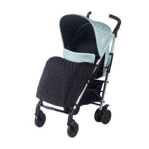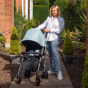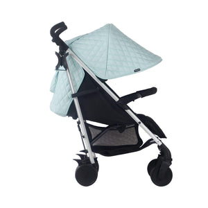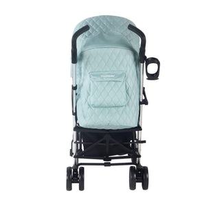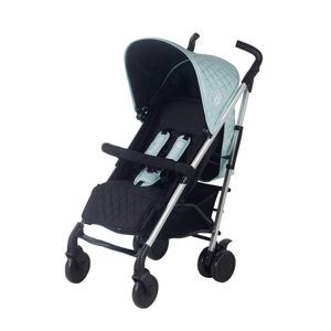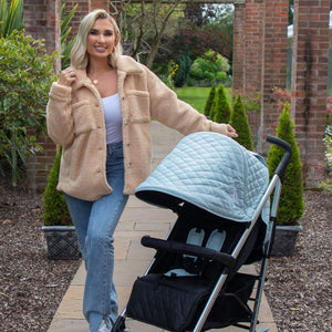This stylish quilted aqua stroller design from Billie Faiers forms part of her Signature Range at My Babiie and combines the style and function you expect from a super talented mum. Tough enough to take everywhere with you and use every day, the lightweight aluminum umbrella fold stroller is packed with features to make using it as comfortable for you and your little as possible. Suitable from birth, the seat reclines right back and has adjustable leg support so your little can sit, or lay back in total comfort, shaded from the sun and elements by an extendable 3 position UPF canopy. Suspension all round and single front wheels means the ride is super smooth, and adjustable handles mean you can push in comfort too. The basket is large and there is a handy pocket at the back of the hood for your phone (or snacks!), and a viewing window so you can maintain a visual of your precious cargo. This lightweight stroller comes with a free cozy footmuff, cup holder, and rain cover so that we have you covered if you are strolling and it starts to rain!