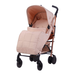 This stylish blush stroller with a rose gold frame design from Billie Faiers forms part of her Signature Range at My Babiie and combines the style and function you expect from a super talented mum. Tough enough to take everywhere with you and use every day, the lightweight aluminum umbrella fold stroller is packed with features to make using it as comfortable for you and your little as possible. Suitable from birth, the seat reclines right back and has adjustable leg support so your little can sit, or lay back in total comfort, shaded from the sun and elements by an extendable 3 position UPF canopy. Suspension all round and single front wheels means the ride is super smooth, and adjustable handles mean you can push in comfort too. The basket is large and there is a handy pocket at the back of the hood for your phone (or snacks!), and a viewing window so you can maintain a visual of your precious cargo. This lightweight stroller comes with a free cozy footmuff, cup holder, and rain cover so that we have you covered if you are strolling and it starts to rain!