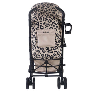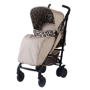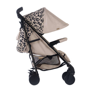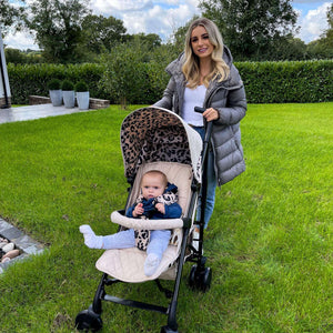 This stylish fawn-coloured leopard print stroller from Dani Dyer forms part of her Cherish collection at My Babiie and combines the style and function you expect from a super talented mum. Tough enough to take everywhere with you and use every day, the lightweight aluminium umbrella fold stroller is packed with features to make using it as comfortable for you and your little one as possible. Suitable from birth, the seat reclines right back and has adjustable leg support so your little can sit, or lay back in total comfort, and shade from the sun and elements by an extendable 3 position UPF canopy. Suspension all round and single front wheels means the ride is super smooth, and adjustable handles mean you can push in comfort too. The basket is large and there is a handy pocket at the back of the hood for your phone (or snacks!), and a viewing window so you can maintain a visual of your precious cargo. This lightweight stroller comes with a free cosy footmuff, cup holder and rain cover so that we have you covered if you are strolling and it starts to rain!