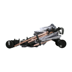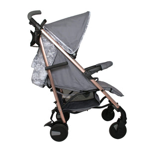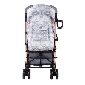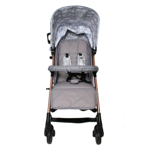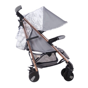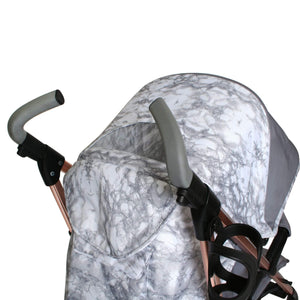 This stylish grey marble design with a rose gold frame design from Samantha Faiers forms part of her Dreamiie range at My Babiie and combines the style and function you expect from a super talented mum. Tough enough to take everywhere with you and use every day, the lightweight aluminum umbrella fold stroller is packed with features to make using it as comfortable for you and your little as possible. Suitable from birth, the seat reclines right back and has adjustable leg support so your little can sit, or lay back in total comfort, shaded from the sun and elements by an extendable 3 position UPF canopy. Suspension all round and single front wheels means the ride is super smooth, and adjustable handles mean you can push in comfort too. The basket is large and there is a handy pocket at the back of the hood for your phone (or snacks!), and a viewing window so you can maintain a visual of your precious cargo. This lightweight stroller comes with a free cozy footmuff, cup holder, and rain cover so that we have you covered if you are strolling and it starts to rain!