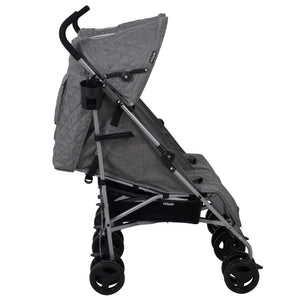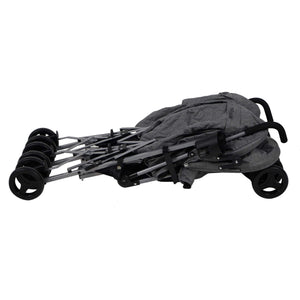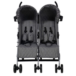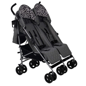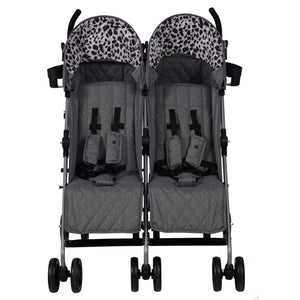 The My Babiie trend-setting grey melange double stroller was created so your littles can stroll together in style. With stylish grey melange fabrics and a cool leopard print pattern inside of the hoods, this is the perfect affordable solution for firstborns & siblings or twins. This twin stroller is lightweight and super easy to fold away and open for its class, but still sturdy enough to handle 2 kids up to 15kg (each). There are pockets in each hood for your essentials, and large baskets under each seat so you have room to take everything you need out and about. Suitable from birth with adjustable leg rests and multi-position recline. The large UV-protected canopy above makes them super comfortable and safe to ride and nap in. Although it's a double stroller, its lightweight frame allows for agile handling and maximum portability, folding down neatly and compactly. One doubly-superb design, that's perfectly comfy & stylish for two.